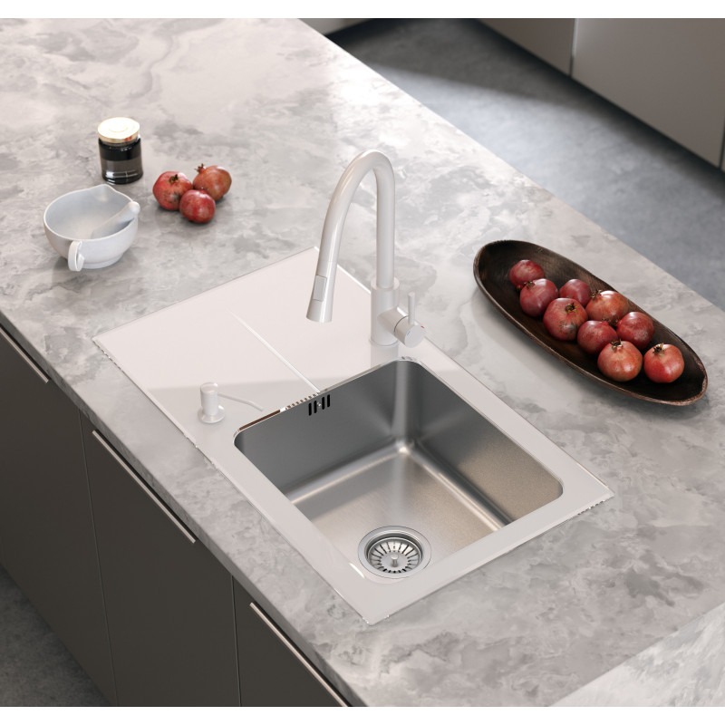 - Especificações Sob tampo Lava-louças de uma bacia Aço inoxidável + Vidro Medida total 770 mm Medida interna Cuba 350×400 mm Profundidade 190 mm Acessórios de fixação Móveis de 45 cm Reversivel